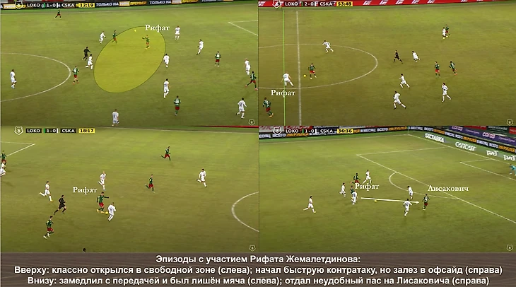 Жемалетдинов из мобильного ромба "Локо" несколько выпадал: не к месту замедлял темп атаки и выдавал неудобные/неточные передачи (точность - 69%), хотя хорошо открывался в свободные зоны и потенциально мог стать главной креативной единицей (17 передач в финальную треть - больше всех в команде).