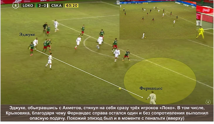 Вышедший на левый фланг Эджуке (7 обводок и 6 касаний в штрафной - лучшие показатели в матче) добавил проблем Рыбчинскому и стягивал на себя ромб "Локомотива", благодаря чему на правом краю свободную зону получал Марио - именно из такого эпизода родился пенальти.