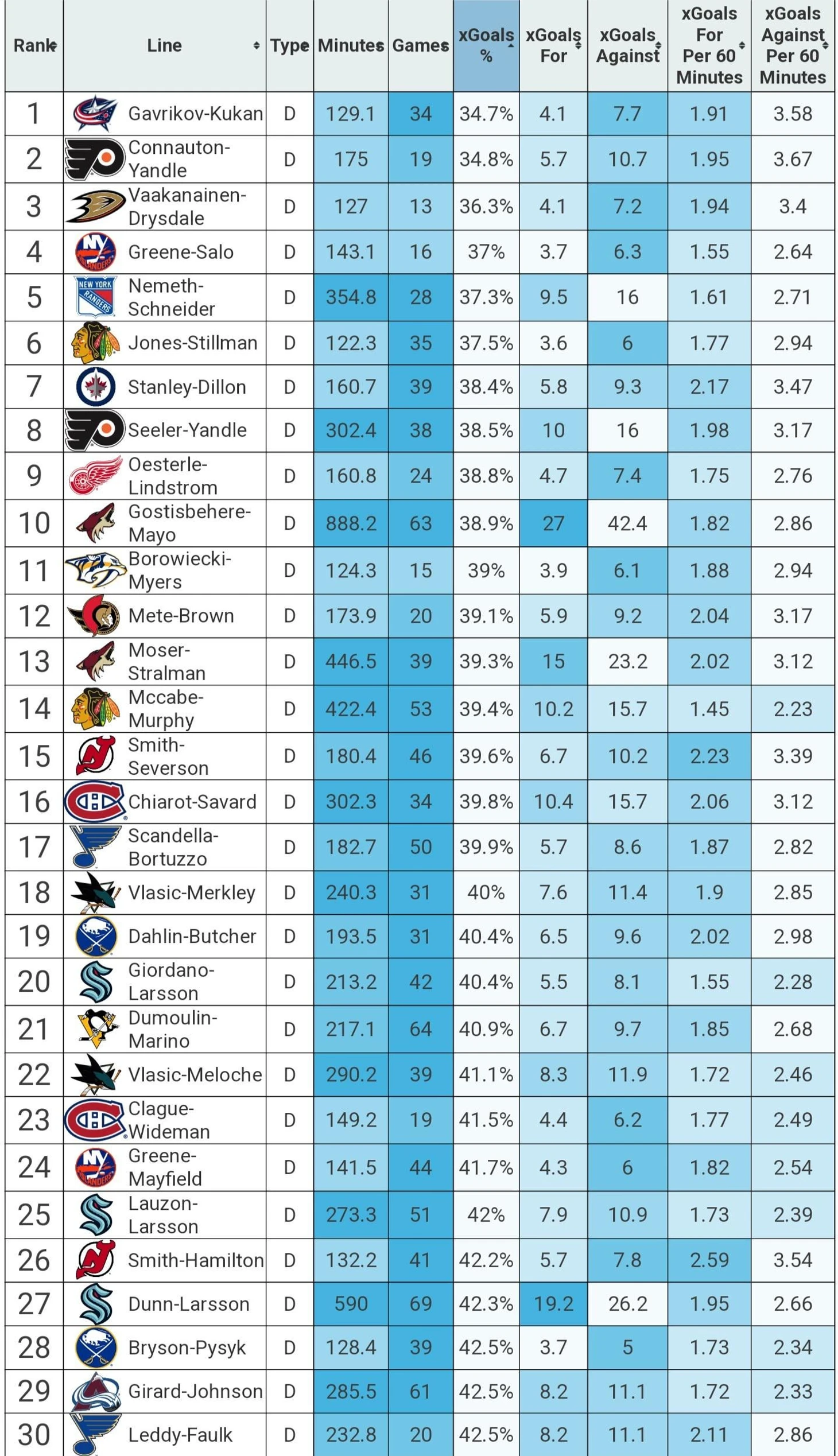Использовалась продвинутая статистика xGoals - отношение ожидаемых голов в чужие/свои ворота когда пара защитников находилась на льду, естественно в равных составах!