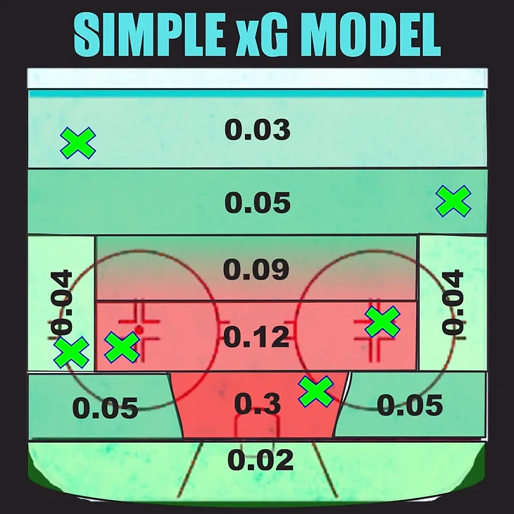 Чтобы проще было понять, возьмём в качестве примера Остона Мэтьюза. За игру нанёс 6 бросков (с тех зон, где стоят зелёные крестики, смотри картинку ниже). Его показатель ожидаемых голов будет 0,66 = (0,03+0,05+0,04+2x(0,12)+0,3). Затем суммируя показатели всех матчей определяется сколько он должен был забить (наиграл) за сезон.
