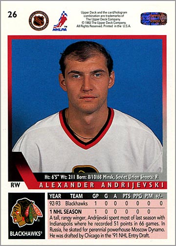 Форварда-гренадёра (196 см) Чикаго задрафтовал под 220 пиком. 27 декабря 1992 Андриевский дебютировал за Чикаго. Тот матч стал не только первым, но и последним в НХЛ.