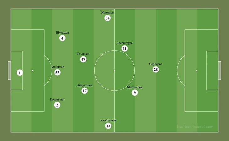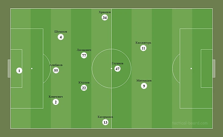 Для начала поговорим про схему. Играют по схеме 3-5-2. 3 центральных защитника – Ковачевич, Алибеков и Шумахов. Лотерали: Храмцов и Кагермазов. В центре поля: Лисакович и Юсупов (опорные полузащитники), Глушков расположен под двумя нападающими. Впереди Касинутра и Магомедов.
