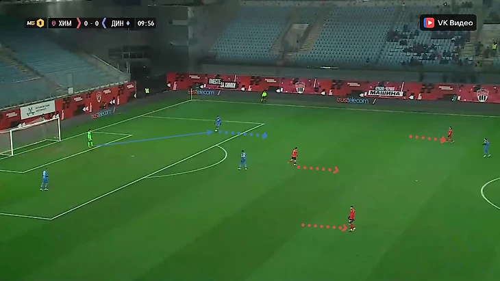 В матче против Химок заметил как взаимодействуют два игрока Храмцов и Костюков. Костюков уходит во фланг, а Храмцов забегает по флангу. 2 игрока Химок думают, что будет передача на Костюкова, но сзади образовалась свободная зона куда и последовала передача.
