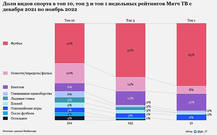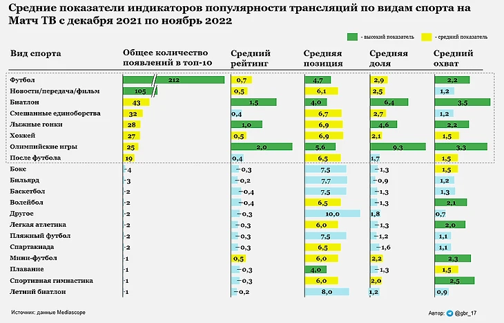 Вторая оговорка - взяты данные с 20 ноября 2021 года по 19 ноября 2022 [города с населением выше 100 тыс., возрастная группа: 4+] включительно. Год в 2022 намеренно ограничен датой начала чемпионата мира по футболу, чтоб избежать смещенности данных из-за уникальной ситуации на российском спортивном телевидении: все матчи сверхпопулярного события транслируются на одном канале, при этом нет трансляций традиционных лидеров рейтинга в зимнее время года - биатлона и лыжных гонок. Чемпионат мира по футболу будет проанализирован позже в отдельной статье.