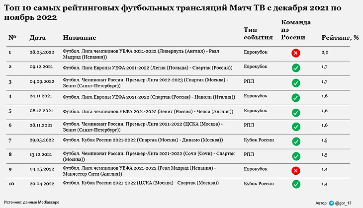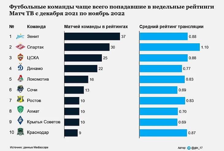 Матч ТВ явно обделяет своим вниманием матчи быков. Например, за рассматриваемый период транслировалось 12 игр Краснодара, 9 из них попали в недельный рейтинг со средним показателем 0,87%. Три оставшихся матча пришлись на конец ноября/начало декабря 2021 года, когда большинство позиций в рейтинге занимал биатлон и нижним порогом для попадания в десятку было значение в районе 1,0-1,3%. Все оставшиеся 9 матчей попали в недельный рейтинг, включая не самые громкие афиши «Краснодар - Урал» и «Краснодар - Химки».