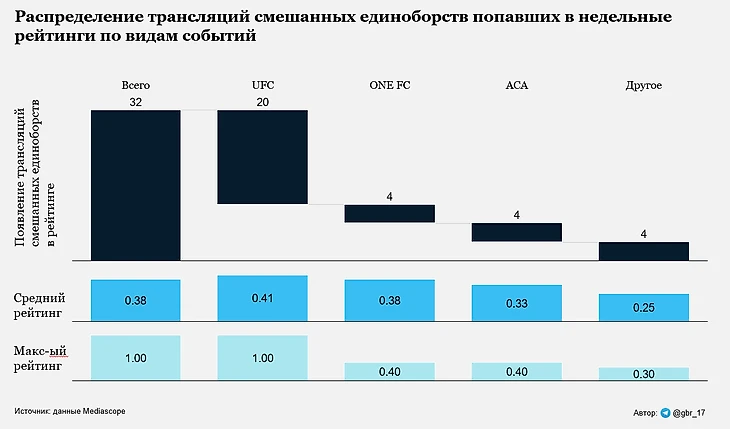 Средний рейтинг трансляций смешанных единоборств находится на одном уровне с видами спорта, которые попадали в рейтинг считанное количество раз, то есть UFC показывали чаще, чем он того заслуживает, если судить исключительно по рейтингам. Однако это тот самый случай, когда важен контекст - большинство трансляций смешанных единоборств приходится на ночное время суток, а значит, фактически не отнимает эфирное время у более рейтинговых спортивных событий.