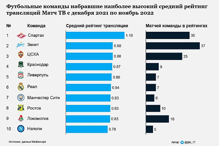 По среднему рейтингу трансляций Спартак лидирует с огромным отрывом. Отдельные команды зарубежных чемпионатов могут посоперничать с командами РПЛ по среднему рейтингу трансляции - Ливерпуль, Реал и Манчестер Сити. В контексте уходящего года это определено поздними стадиями плей-офф Лиги Чемпионов.