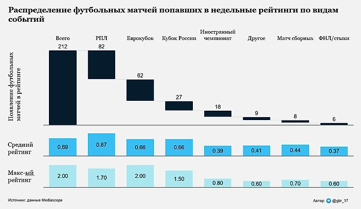 Уверенное лидерство за РПЛ. Средний рейтинг матчей внутреннего первенства выше показателей еврокубковых матчей, и намного выше зарубежных чемпионатов. Ставка на РПЛ и борьба Матч ТВ за телеправа перед началом сезона понятны, это самый востребованный продукт для российских телезрителей.