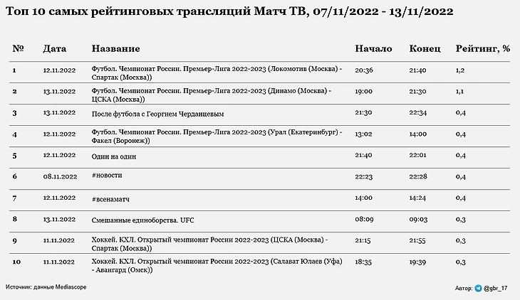 Вот так, например, выглядит недельный рейтинг Матч ТВ с 07.11.2022 по 13.11.2022: