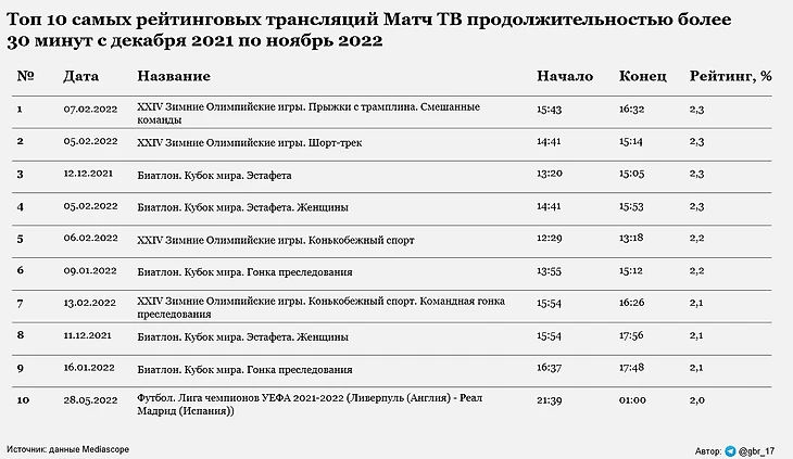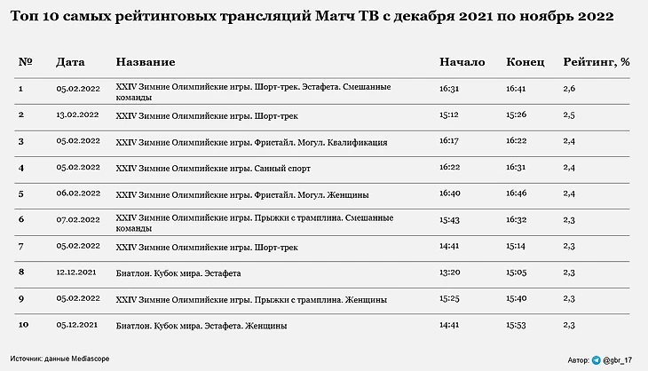 Примечательно, что сразу 5 из 10 самых рейтинговых событий пришлись на один день - 5 февраля 2022 года, причем состязания шли практически одно за другим. Причин тому может быть несколько - от потенциальной «медальности» трансляций до тривиального отсутствия конкуренции со стороны других телеканалов в тот конкретный временной слот.