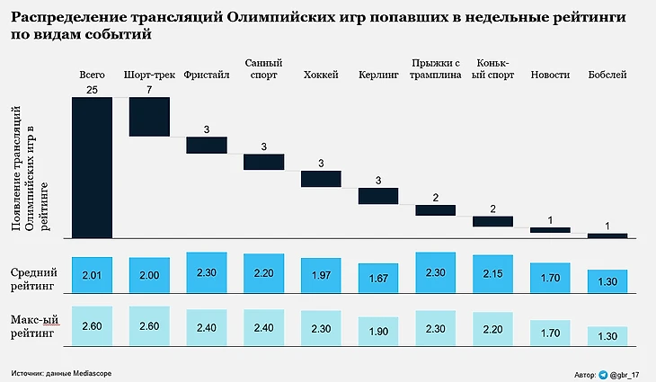 Весомых различий между видами спорта нет - показатели ровные, то есть важна скорее совокупность, сам статус мероприятия, а не его наполнение. Наиболее высокие средние рейтинги пришлись на фристайл. Запомним этот факт и не удивимся, если в ближайшие циклы олимпийское движение сделает упор на развитие этого вида спорта.
