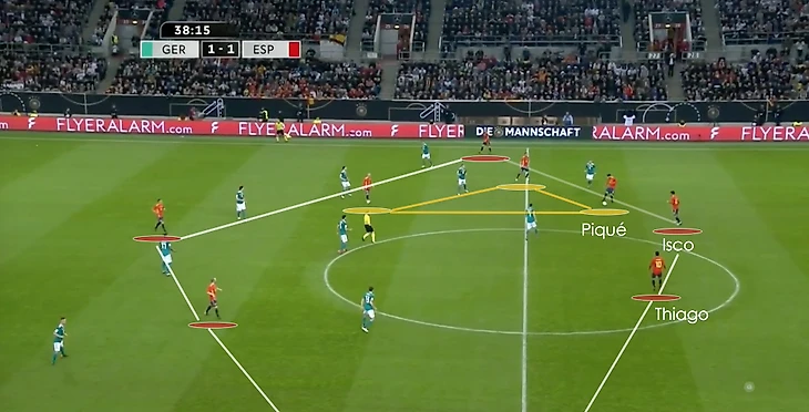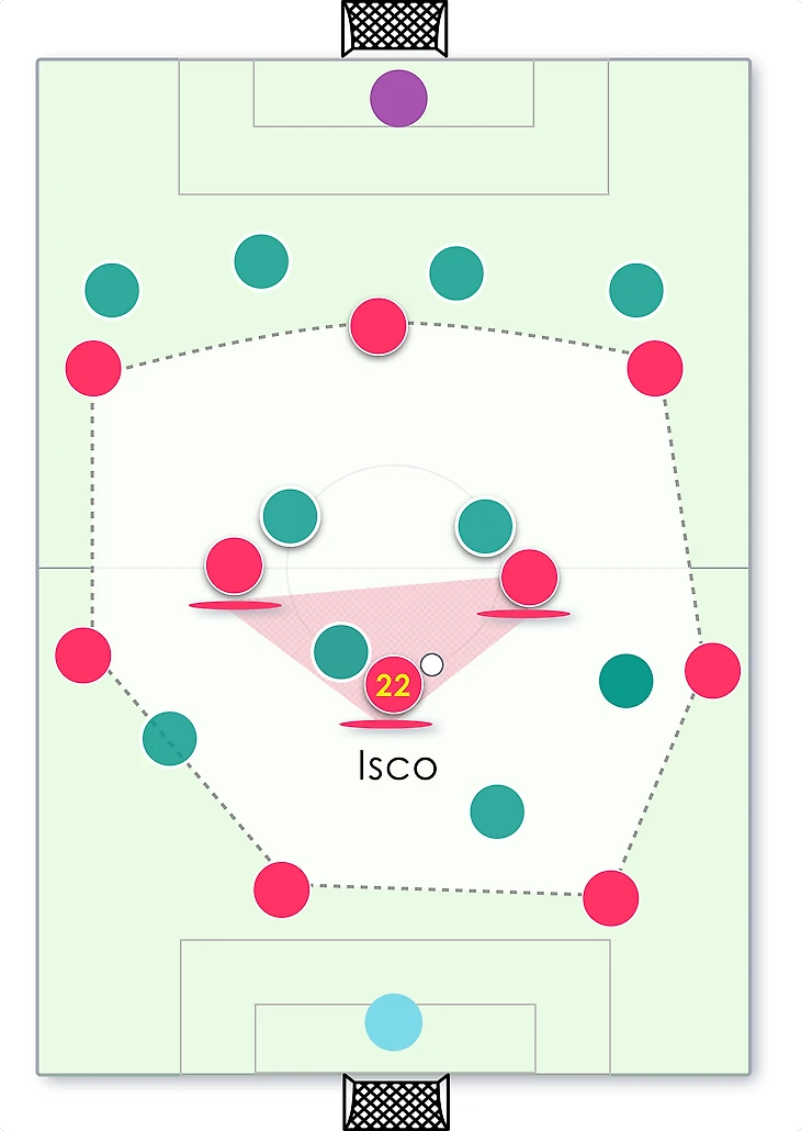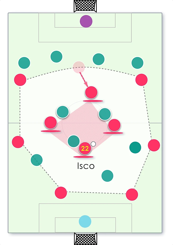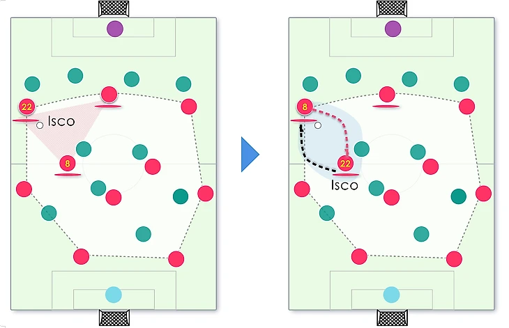 Пике входит внутрь. Иско и Тиаго выходят наружу, чтобы сбалансировать Основную Структуру. Это дезорганизует противника и позволяет найти свободные участки поля.