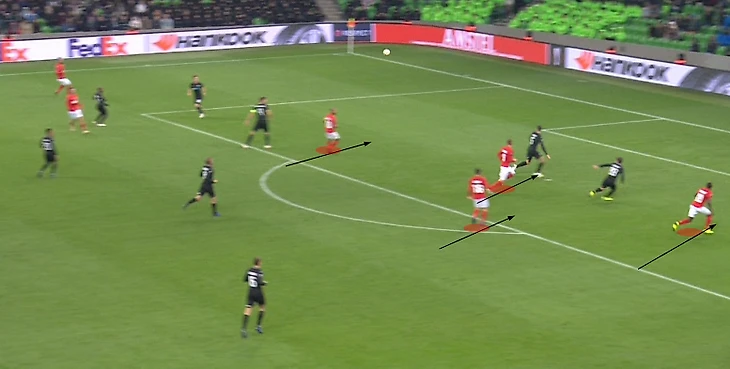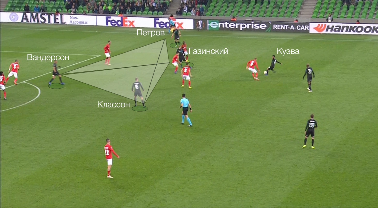 Куэва стягивает на себя двух игроков Стандарда. Вандерсон забирает подбор в пустой зоне и организует момент через стеночку с Ари.