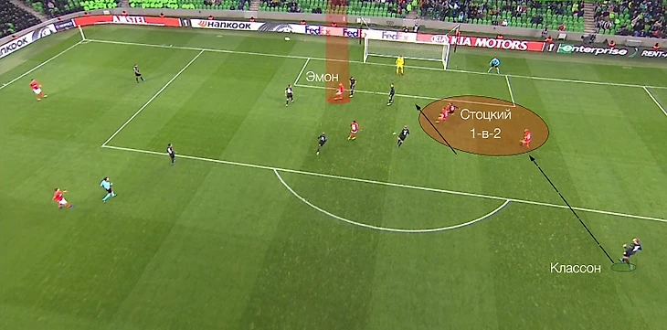 Стоцкого оставляют в ситуации 1-в-2, он совершенно верно играет по самому опасному сопернику, который движется в центр. У Классона - лучшая позиция для просмотра гола.