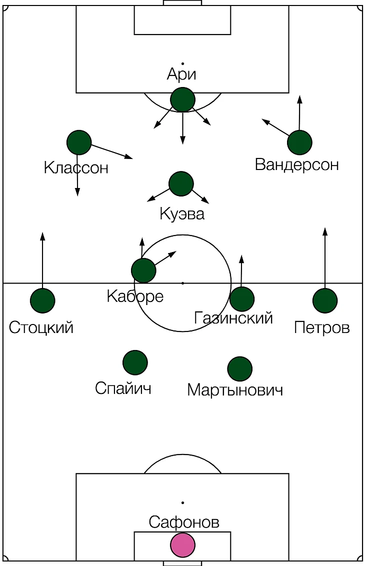 3. Уход Каборе. Шапи вышел на свой любимый правый фланг атаки, Вандерсон переместился налево, а Ари с Игнатьевым стали вдвоенным центром. Перейра при необходимости помогал Газинскому в опорной зоне