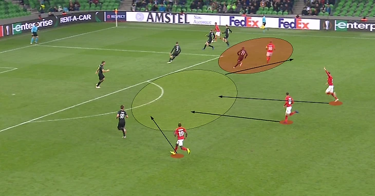Еще один потенциал, который до конца не реализуется в начальной стадии атак Краснодара, - это продвижение Спайича с мячом. Серб часто выбирает консервативное решение с пасом на фланг, нежели потенциальный прогрессив ран: