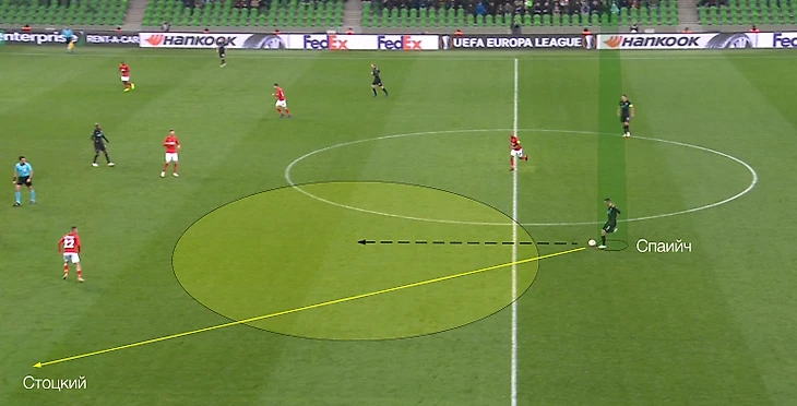 Стоцкий в таких ситуациях редко оказывается в выгодной позиции (защитная структура соперника полностью сохранена) и возвращает мяч назад.