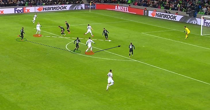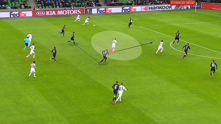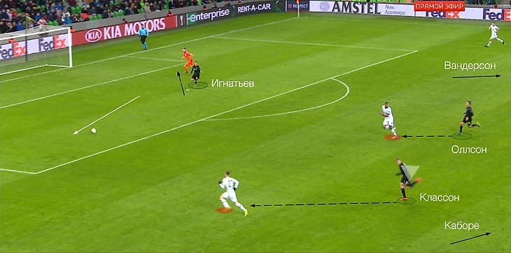 Классон указывает Вандерсону, чтобы закрывал своего игрока, во время своего рывка смотрит, поддерживает ли его Каборе. В итоге именно африканец перехватит мяч после шикарного давления.