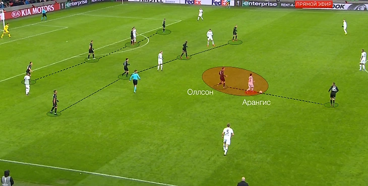 В позиционной обороне хозяева выстраивались модулем 4-4-1-1 (4-5-1), где Олссон играл практически персонально по опорнику Арангису, не давая тому комфортно начинать атаки.