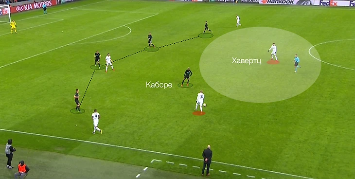 Силы у «Краснодара» закончились минуте к 60-й. Окончательно просела опорная зона. Каборе перестал перекусывать зарождающиеся атаки «Байера», Перейра не поспевал страховать его, задерживаясь на чужой половине. Пустующая зона 14 регулярно насыщалась Брандтом, Хавертцом или Фолландом. Пара скриншотов, показывающих происходившее во втором тайме в опорной зоне «Краснодара»:
