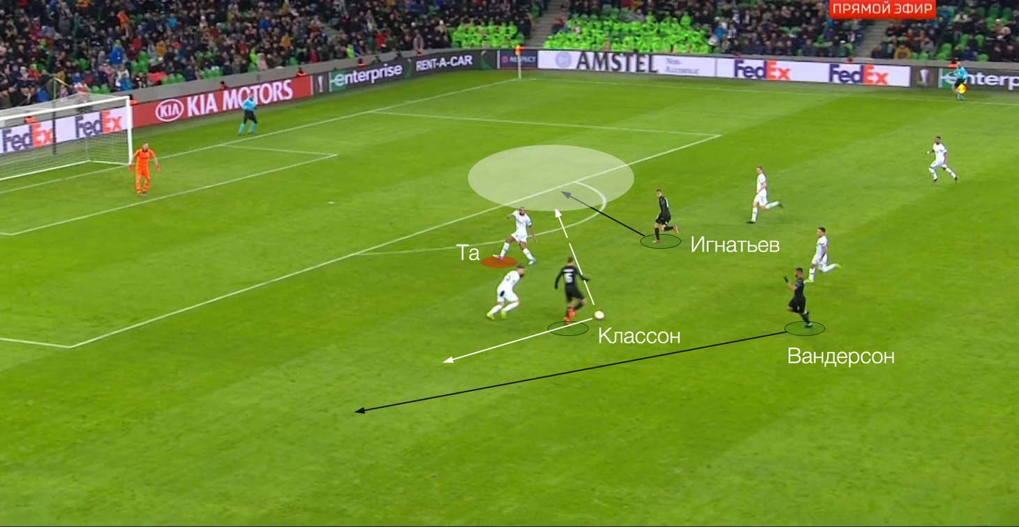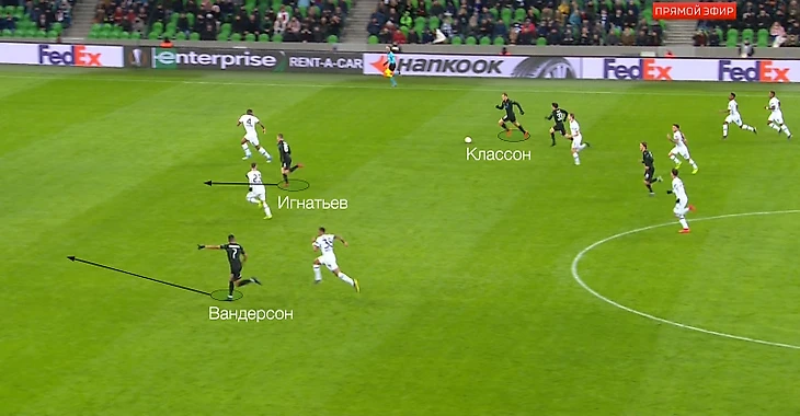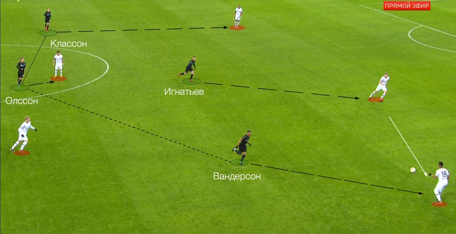 Та неловко тормозит, Игнатьев делает грамотный рывок ему за спину в пустую зону. У Классона мяч удобно под ногой, но пас следует на Вандерсона.