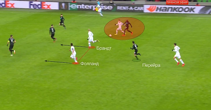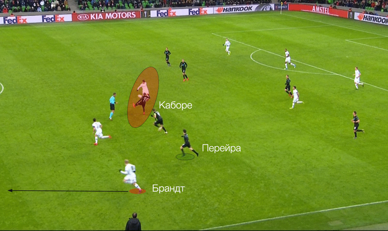 Каборе проигрывает борьбу. Перейра не успевает за рывком Брандта. Спайич выполняет свою работу.