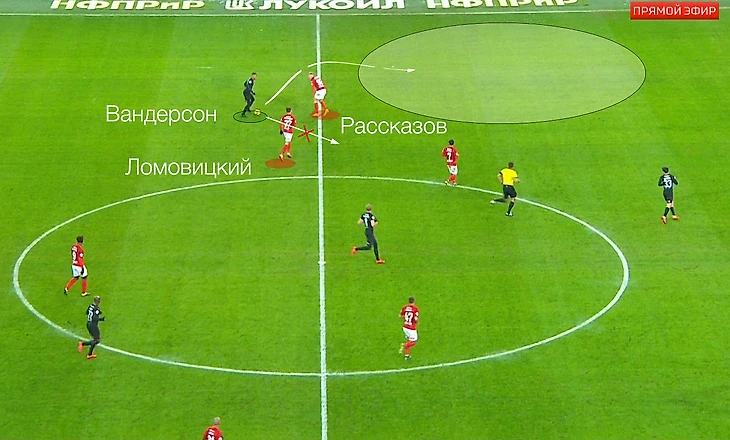 Обратите внимание, в моменте перед спартаковским голом, как Вандерсону неудобно смещаться в левый полуфланг, когда мяч находится на ближней стороне к защитнику. Таких эпизодов за игру на непрофильном фланге скопилось слишком много, вот ещё один из них: