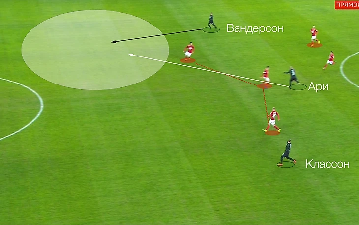 Айртон задерживается атаке, Ари в своём стиле классно цепляет мяч и переводит его в темп на Вандерсона.