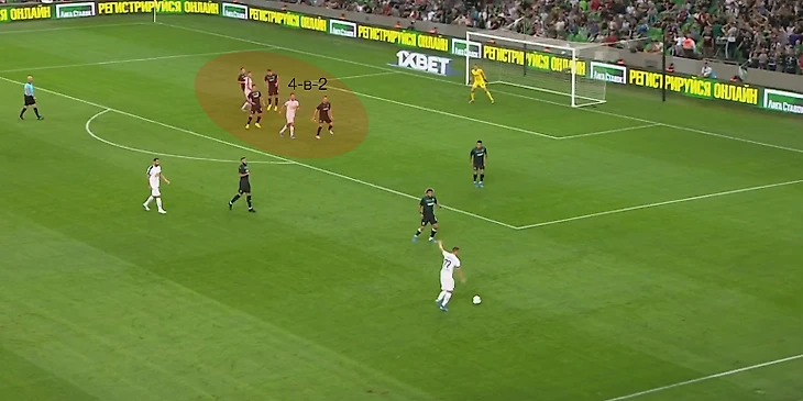 В опорной зоне расположились Гацкан и Тимофеев. Шарнирные перемещения Зиньковского превращали модуль из формальных 4-2-3-1 в 4-4-2 (с вариацией 4-2-2-2) в высоком и среднем блоке и в 4-5-1 в низком блоке.