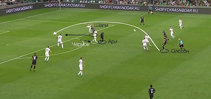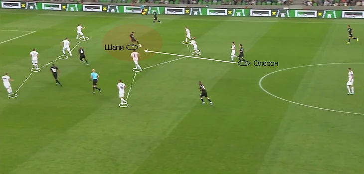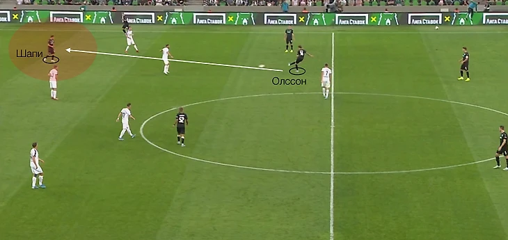 Заметьте, почти все подобные передачи Олссон отдал с минимальным давлением со стороны гостей. Было видно, как швед получает настоящее удовольствие от таких условий игры. Все эти финты, развороты, переступы через мяч. Всегда отрытый Шапи. Кайф. Судя по хайлайтам, именно так он играл в Швеции.