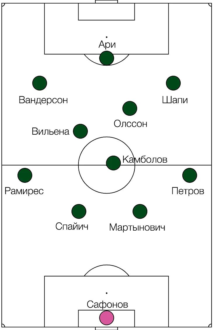 На послематчевой пресс-конференции, отвечая на мой вопрос по поводу состава, Божович сказал, что планировал сыграть агрессивно против короткого паса «Краснодара». Получилось скверно. Главная причина - расположение Камболова и движение Олссона. Руслан либо встраивался крайним правым центральным защитником, либо вовсе уходил на место правого фулбека (Петров поднимался ещё выше), если в полуфланг опускался Олссон: