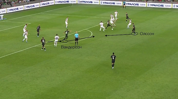 Типичный момент. Вандерсон бежит к мячу и встречается в одной точке с Олссоном.