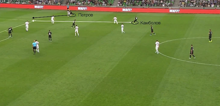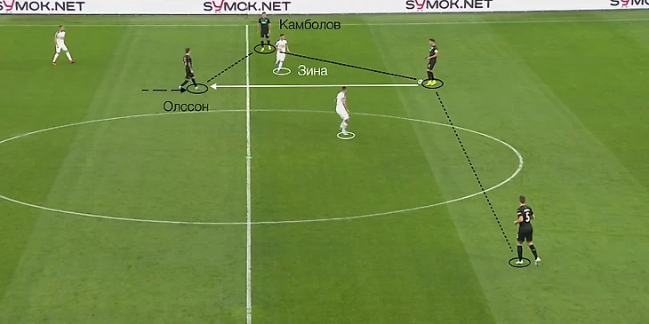В начале сезона, когда Мусаев только искал место Камболова в позиционной структуре, мы размышляли над тем, что при перестроениях на трёх игроков в первой линии билдапа Руслану удобней играть именно в правом полуфланге/фланге. Так лучше раскрывается его длинный пас, который у него качественней, чем у Мартыновича. Ещё одно доказательство: