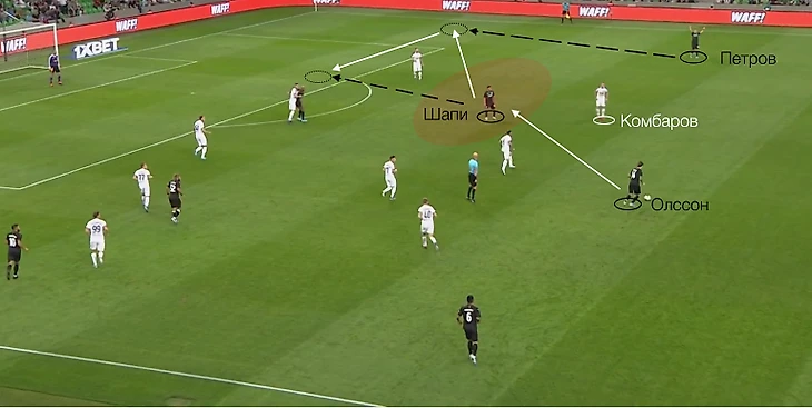 Одинокий Шапи между линий. Петров пользуется узким расположением Комбарова и Полуяхтова для своего фирменного прострела в центр штрафной.