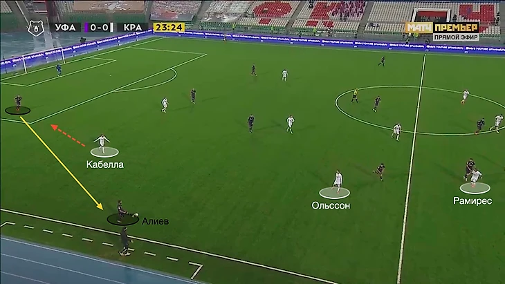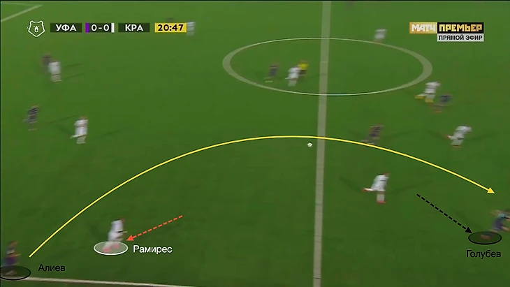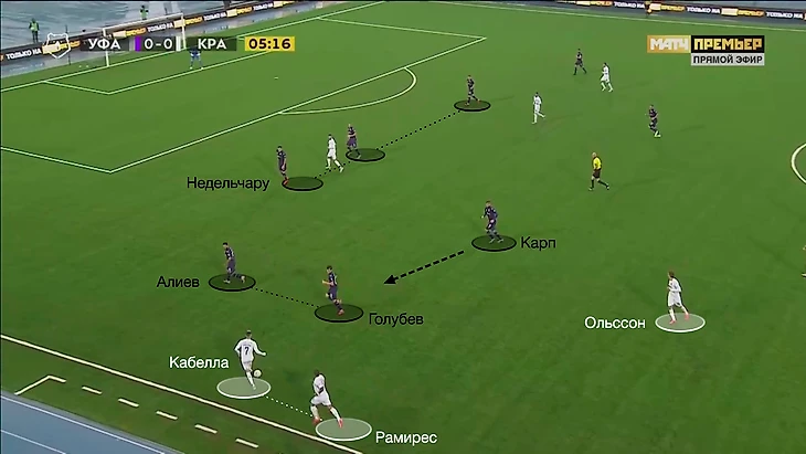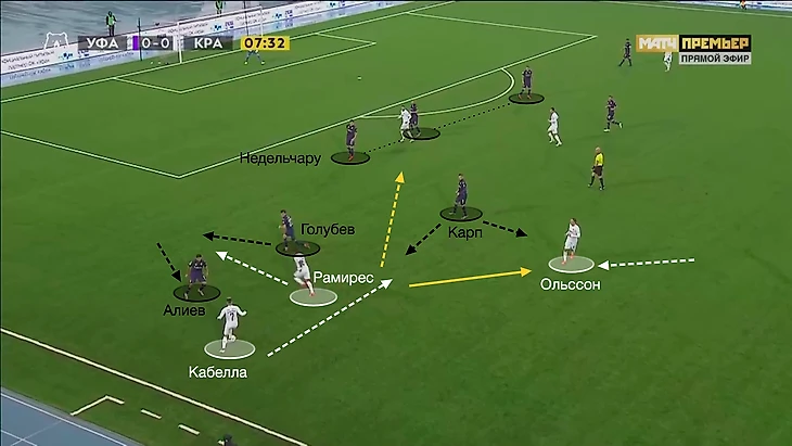 Недельчару был отрезан от подстраховки. К Алиеву стягивался Голубев (та самая выдернутая на фланг «восьмёрка») – здесь явное качественное преимущество за «Краснодаром». Поэтому для дополнительной подстраховки в полуфланг смещался Карп. При этом Кабелле и Рамиресу регулярно помогал Ольссон.