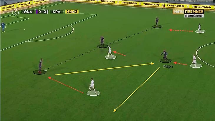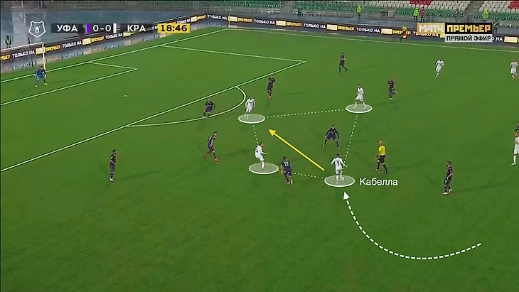 Так создавались локальные ситуации 3-в-3 на фланге, где за счёт смен позиций, мягкого дриблинга Кабеллы или короткого паса игроки «Краснодара» получили опции для продвижения мяча в центр и/или к линии штрафной: