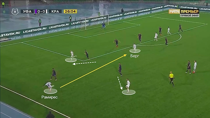 Другим откровением в позиционной игре «Краснодара» в первом тайме стали качественные (!) проникающие (!!) передачи низом (!!!) Рамиреса. Мы привыкли плохому чтению позиционных эпизодов эквадорцем и к его бестолковым навесам, когда он сам себя загоняет в угол. Однако за первый тайм Кристиан сделал 4 уместных и точных передачи с фланга в центр, где их ожидали Берг и Уткин: