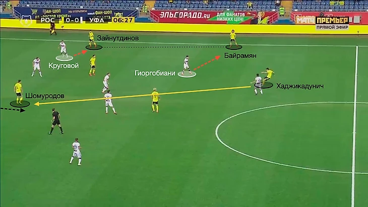 Позиция Зайнутдинова сдерживает Кругового, из-за этого Гиоргобиани ориентирован на Байрамяна и не встречает в полуфланге Хаджикадунича, который отдаёт пас между линий на Шомуродова.