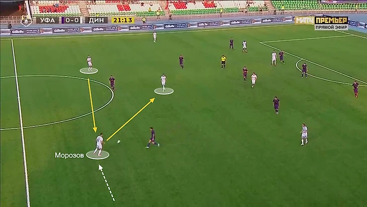 «Динамо» искало «лишнего» игрока в центре за счёт регулярных смещений в полуфланг крайнего правого защитника Морозова: