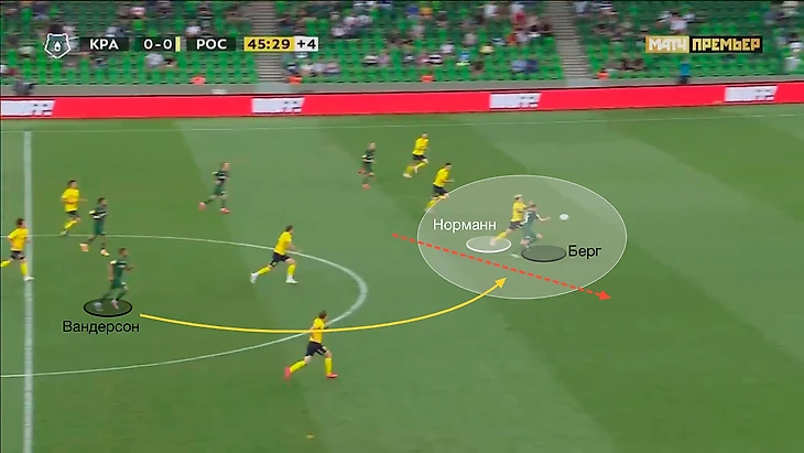 Прямым следствием глубокой позиции Норманна, стали проблемы «Ростова» с прессингом. В центре поля у «Краснодара» оказывался «лишний» игрок, чаще всего Вильена, с помощью этого, «быки» могли преодолевать давление гостей: