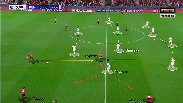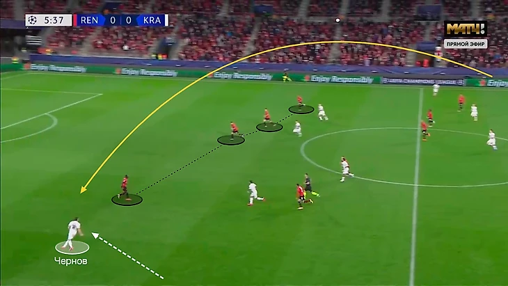 «Ренн» - команда, которая также любит владеть мячом и строить позиционные атаки, как и «быки». Изначально было ясно, что претендовать на доминирующее владение «Краснодар» не сможет, как не сможет регулярно создавать свои фирменные моменты за счёт короткого перепаса перед штрафной и проникающих передач. Персонала для этого у тренерского штаба не осталось. Мусаев решил воспользоваться высокой линией хозяев и сделал ставку на рывки за спину фланговых игроков. Слева забеги под приём, в основном, совершал Чернов: