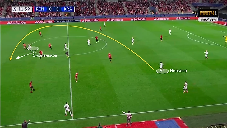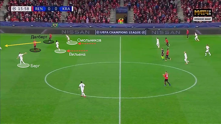 Смольников и Вильена поджимают игроков «Ренна» и заставляют Далберта отдать пас назад. Берг жестом показывает, что нужно подняться выше и продолжить давление. В итоге Гомису приходится выносить мяч точно на Сорокина.