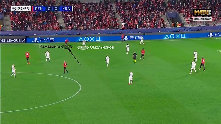 На противоположном фланге у Смольникова были похожие функции. Единственное разница – наличие в этой зоне Камавинги. 17-летний вундеркинд много искал мяч и свободные зоны для приёма – мог уходить как в линию защитников, так и на фланг: