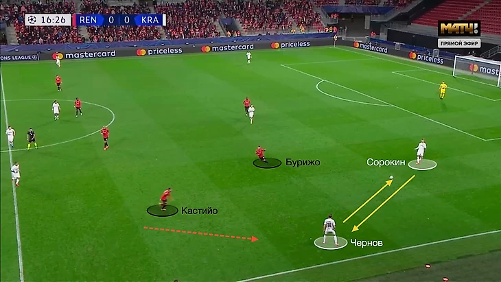 Кастийо включается в прессинг сразу после передачи на Чернова. После обратной передачи Бурижо никак не поддерживает давление на Сорокина и спокойно возвращается в линию.
