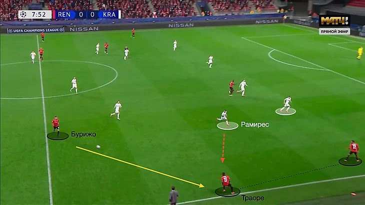 Это, в свою очередь, требовало дополнительной мобильности от крайних в схеме игроков «Краснодара». Здесь пример, когда Рамирес успевает за переключением фланга соперника и провоцирует Траоре вернуть мяч обратно назад Бурижо.