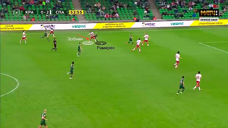 В этом эпизоде возникает микро-момент – за счёт смещения Бакаева в полуфланг образуется локальная ситуация 2-в-1. Вильена уходит с «десяткой» «Спартака» и оставляет свободного Зобнина. Айртон не видит этой ситуации перед собой, возвращает мяч обратно Джикии, и заслуженно получает нагоняй от Романа.