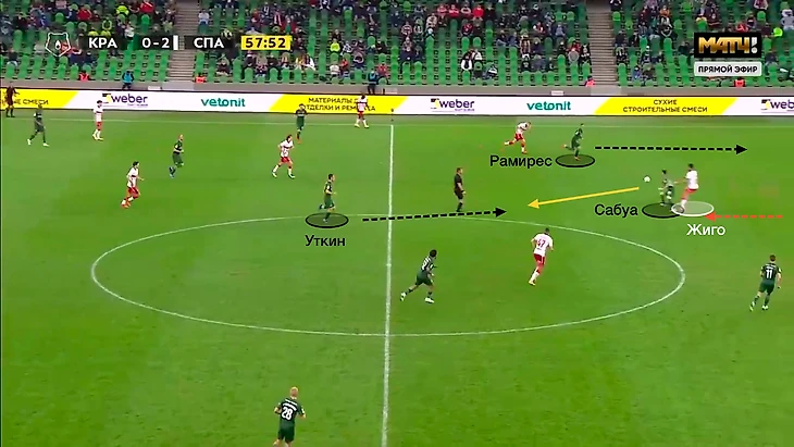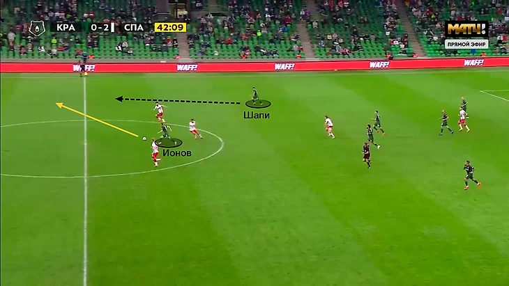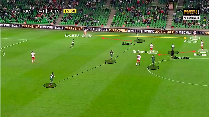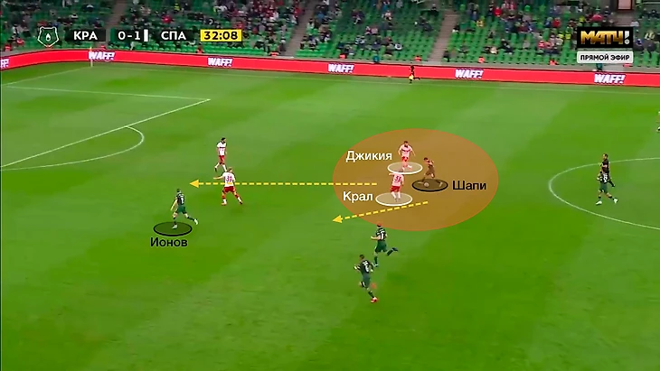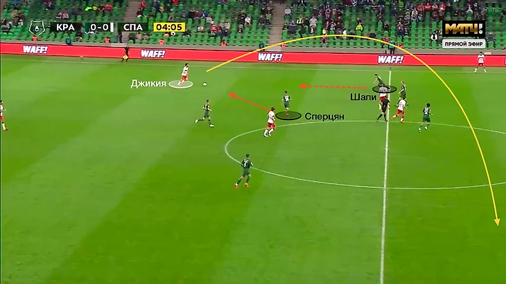 В этом моменте Сперцян увидел, что Шапи сидит слишком глубоко и начал движение в сторону Джикии, который остался один на мяче. Рванул с места и Шапи. При этом капитан «Спартака» всё равно без давления сделал отличную диагональ на Мозеса.