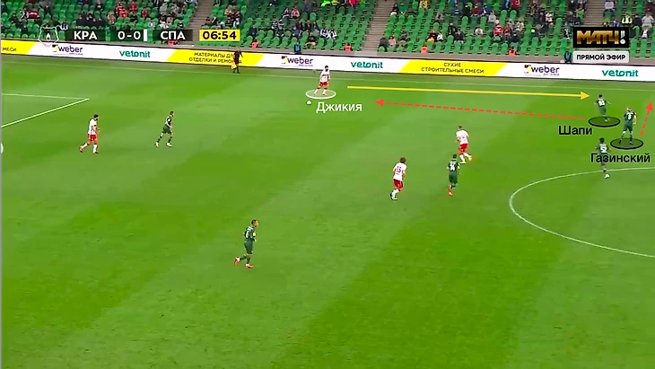 «Спартак» имеет очевидный крен в сторону розыгрыша через Джикию. По нему в этой схеме должен играть Шапи. Как только мяч направляется к Айртону, того по позиции поджимает Смольников.