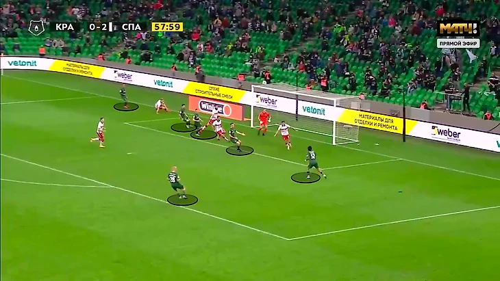 В моменте с голом сразу 6 игроков «Краснодара» успевают оказаться в штрафной. В первом тайме хорошо если одновременно трое «черно-зелёных» оказывались при атаках в штрафной.