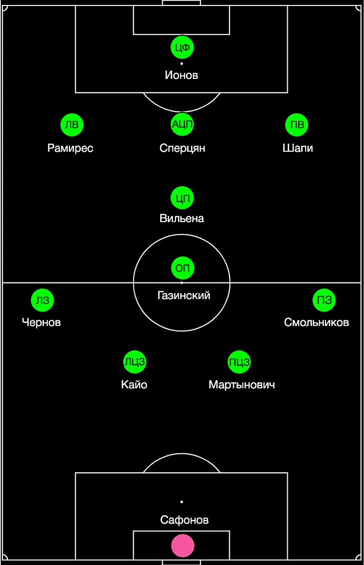 Ближе к концу тайма, Сперцян начал подниматься в первую линию прессинга к Ионову и оказывать давление ещё и на Маслова.